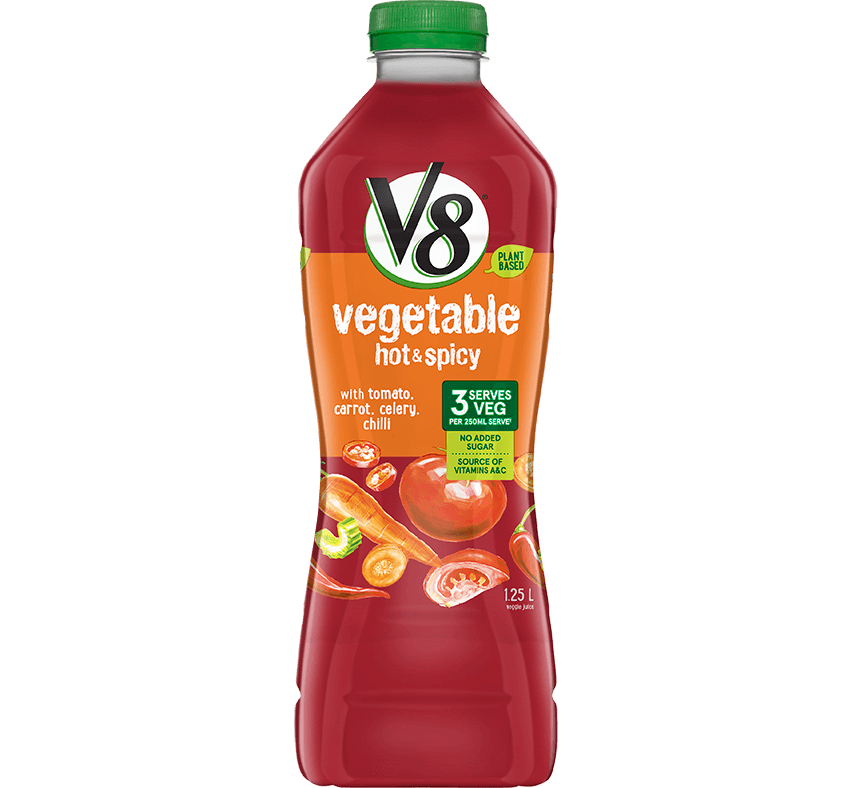 We love mixing vegetables and fruits into delicious blends, so you never have to choose between taste or nutrition: you can enjoy both! Each V8 bottle contains at least one serve of veggies*, and has no added sugar, artificial colours or preservatives – so you can fuel up and feel great. Get the boost you need and grab yourself a V8 today!